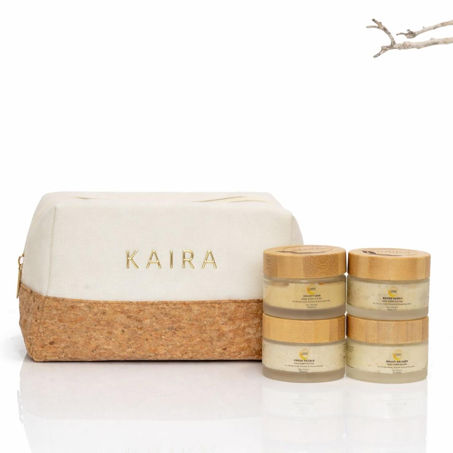 The perfect seasonal gift, thoughtfully crafted and beautifully presented. 4 piece Kaira mini body butter set packed in the Kaira Eco Neutral Make up bag