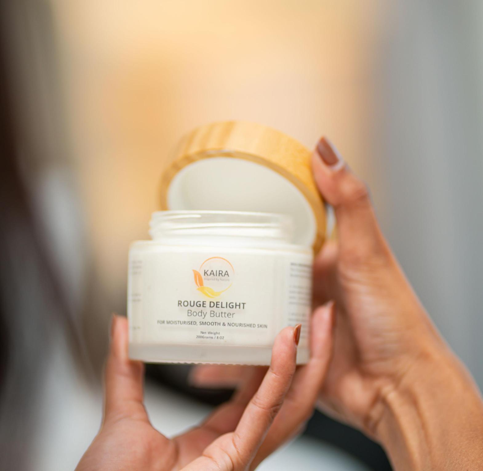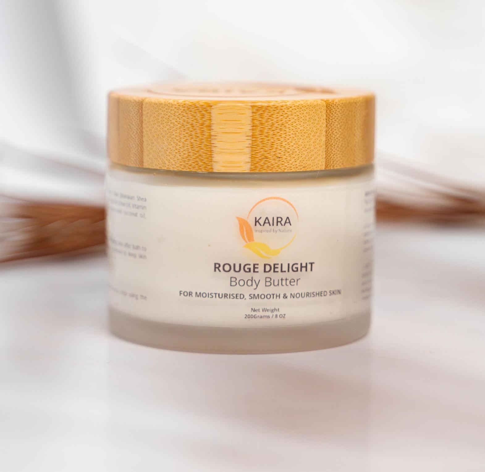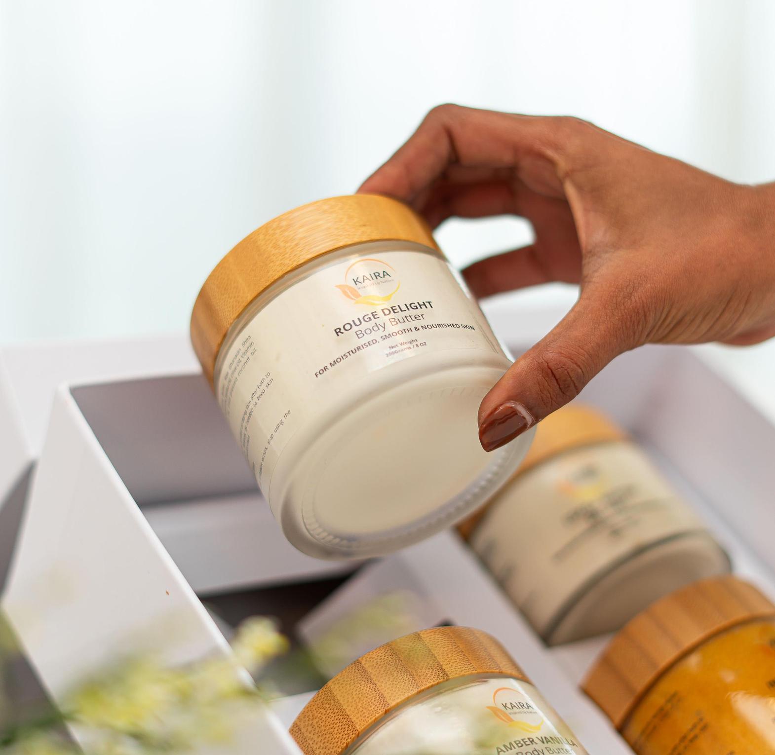 This floral-meets-woody aroma body butter is subtly decadent and also smells powerfully sophisticated. A luxuriously rich, non-greasy whipped Shea body butter which is a unique blend of unrefined raw Shea butter, coconut oil, grapeseed oil, sweet almond oil, vitamin E oil and organic perfume oil. Crafted to deliver nourished skin with the most delectable and luxurious essence of warm, comforting and a little bit sweet finishing, this Luxury Body Butter will keep your skin deeply moisturized, smooth and smelling clean and crisp!
