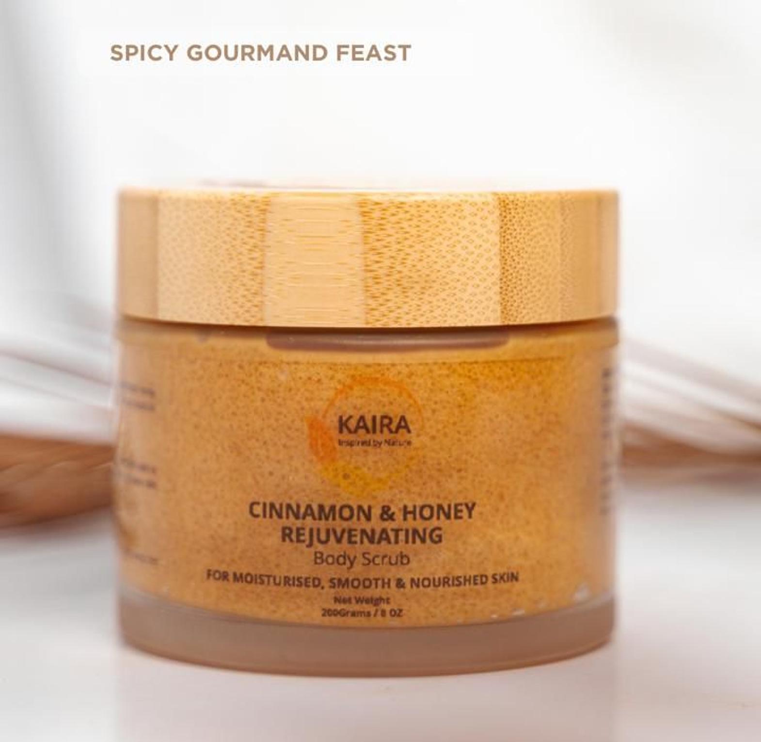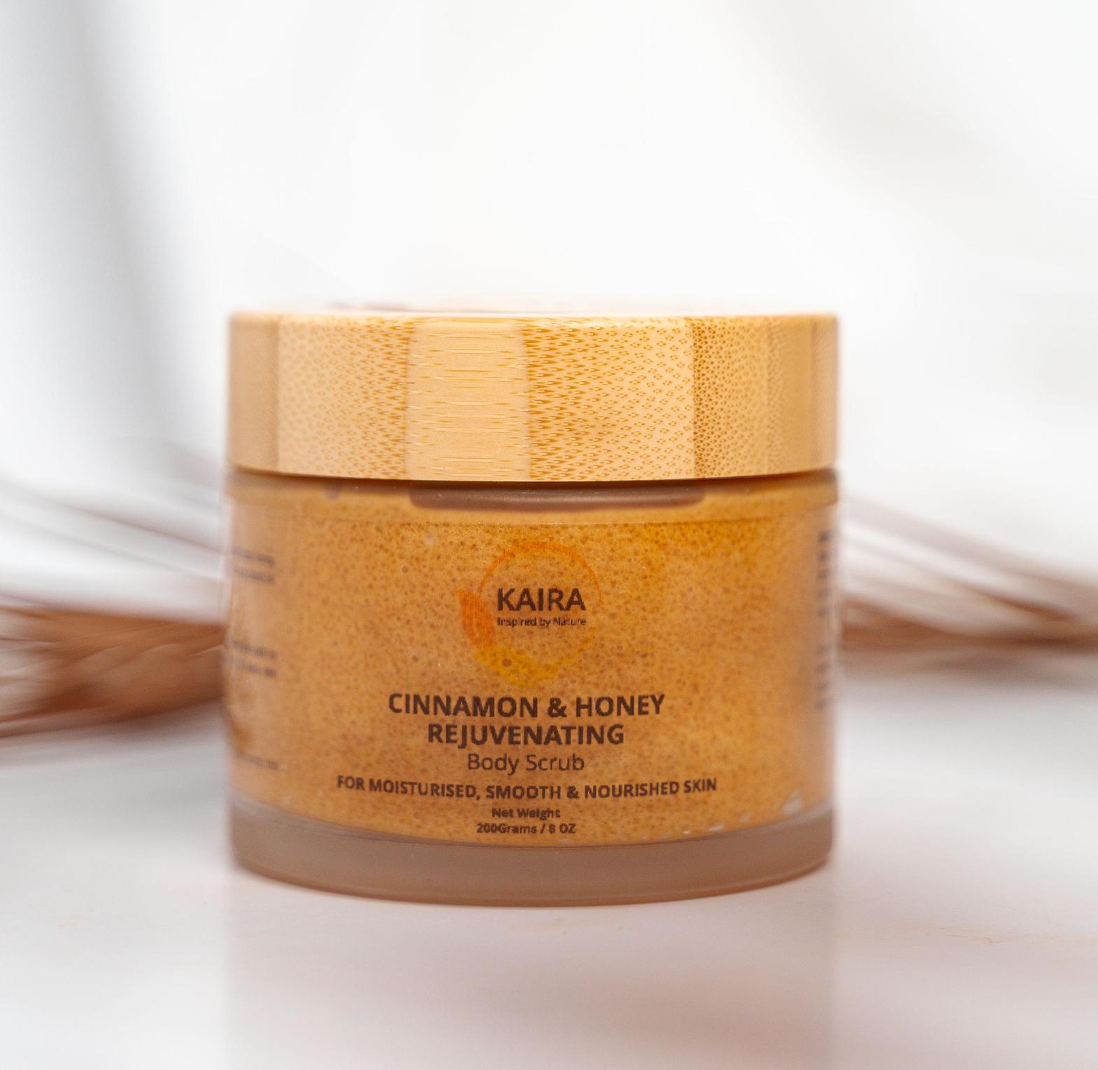 A natural body scrub infused with cinnamon and honey to exfoliate, nourish, and rejuvenate your skin for a radiant glow.