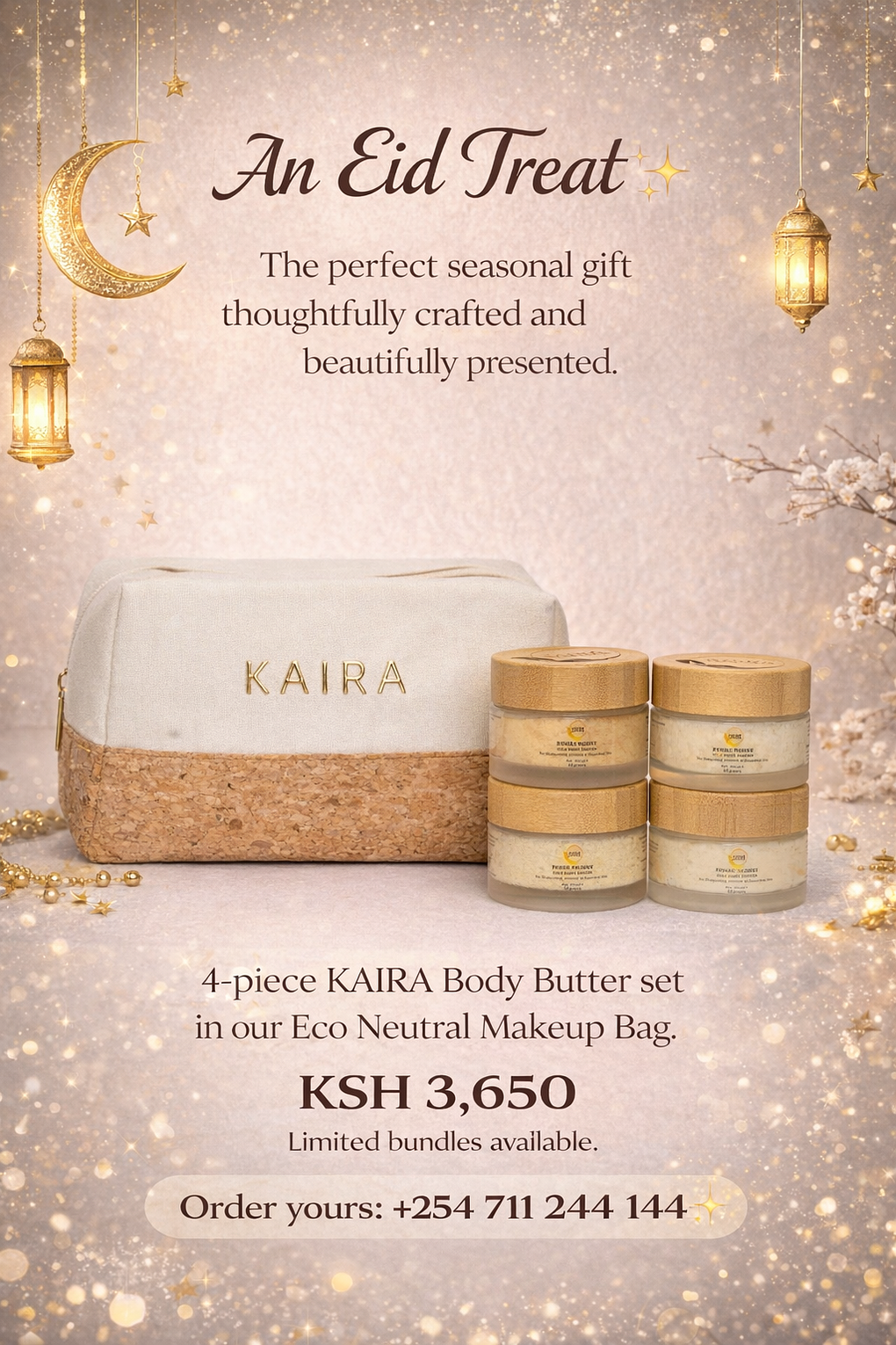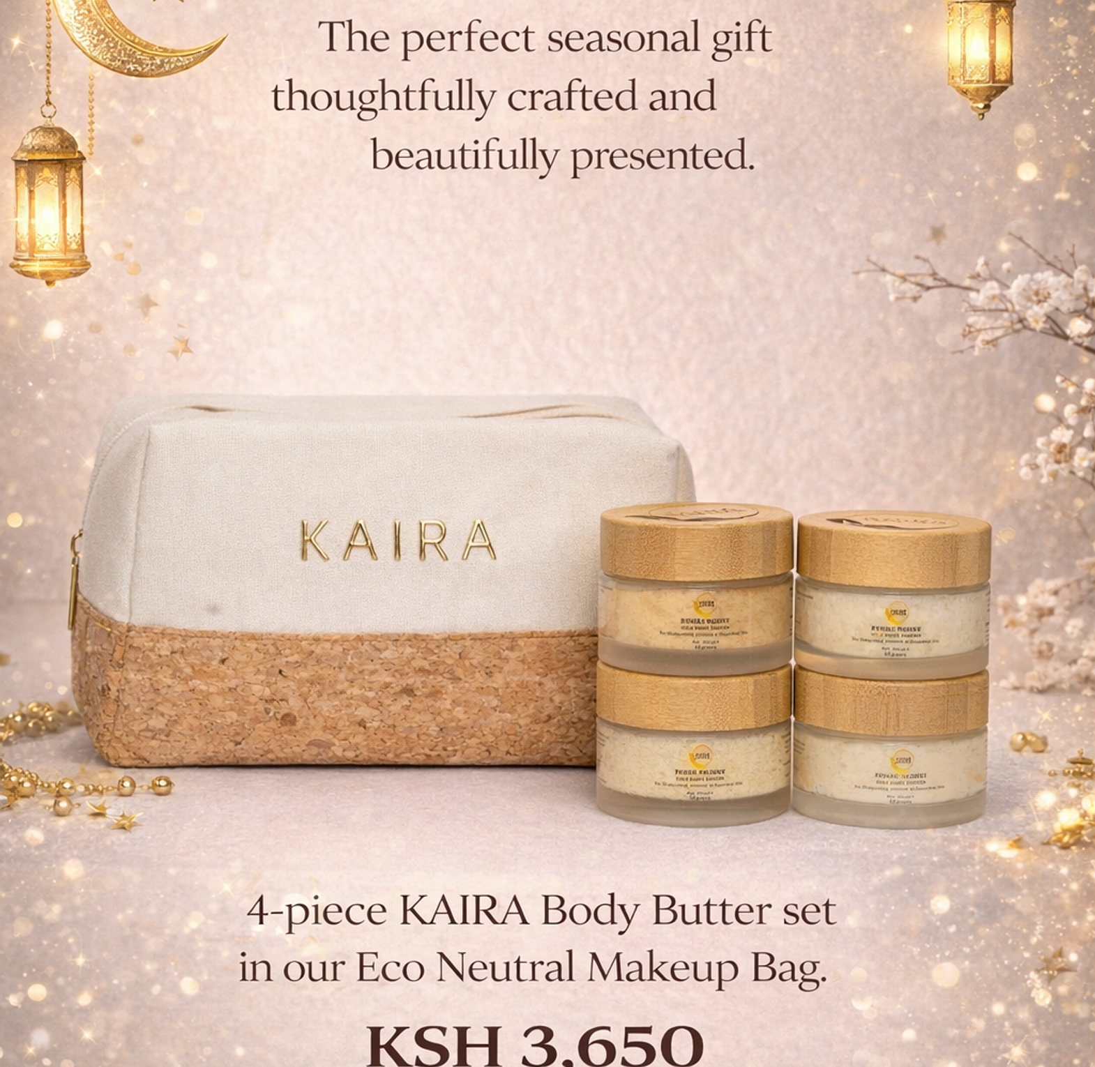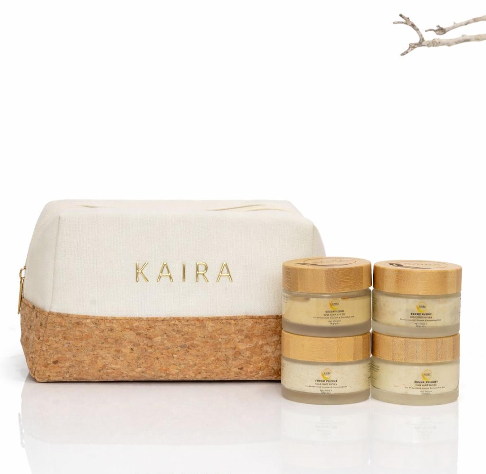 The perfect seasonal gift, thoughtfully crafted and beautifully presented. 4 piece Kaira mini body butter set packed in the Kaira Eco Neutral Make up bag